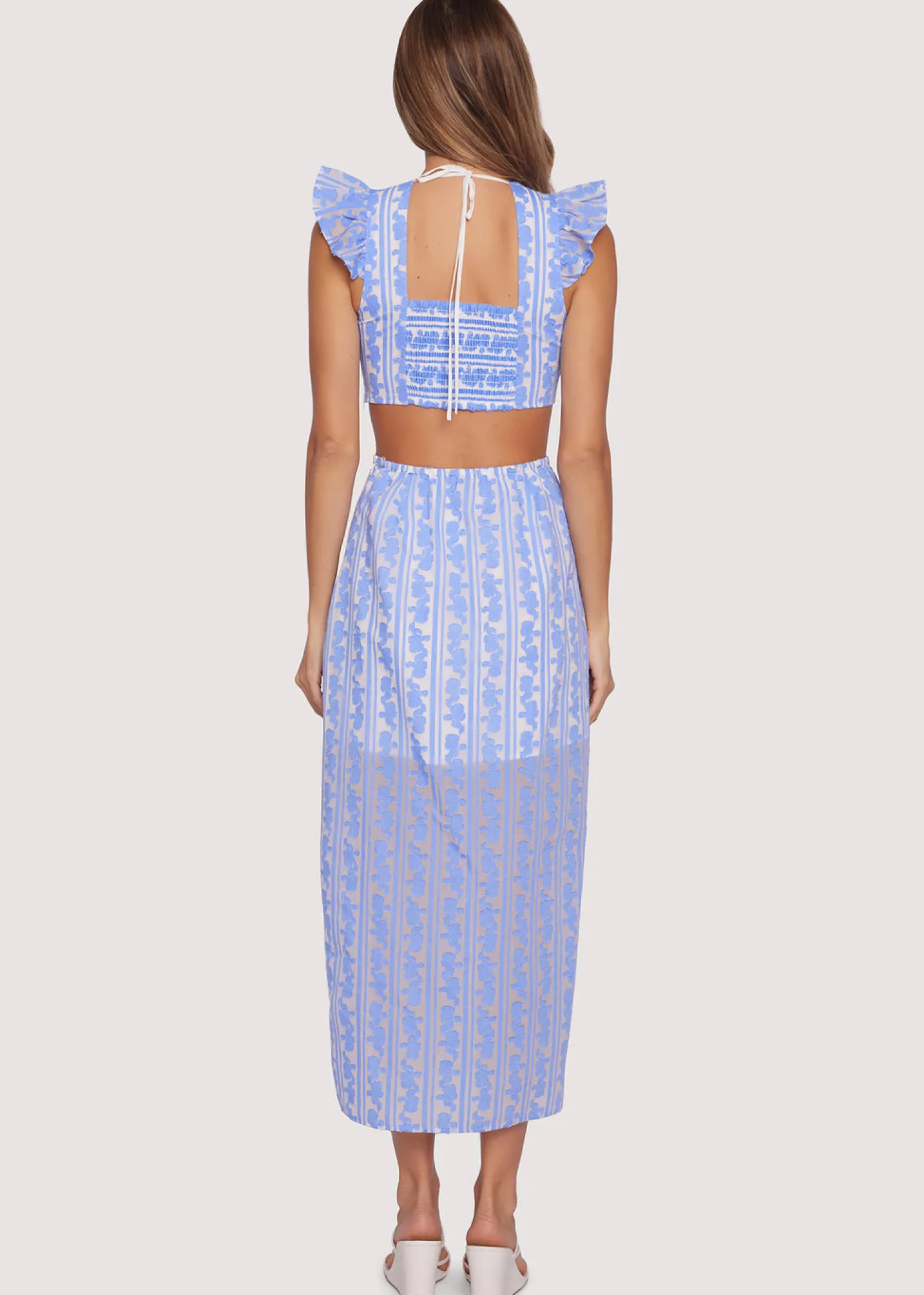 The Crete Escape Maxi Dress is an exquisitely designed garment crafted with intricate embroidered organza. Stand out with a stylish square neckline and flutter cuff sleeves, and adjust the fit with a tie back. The dress is half lined, offering comfort and mobility, while still remaining lightweight and breathable. The side and back cutouts provide extra allure with a high front slit for a unique and distinctive style.