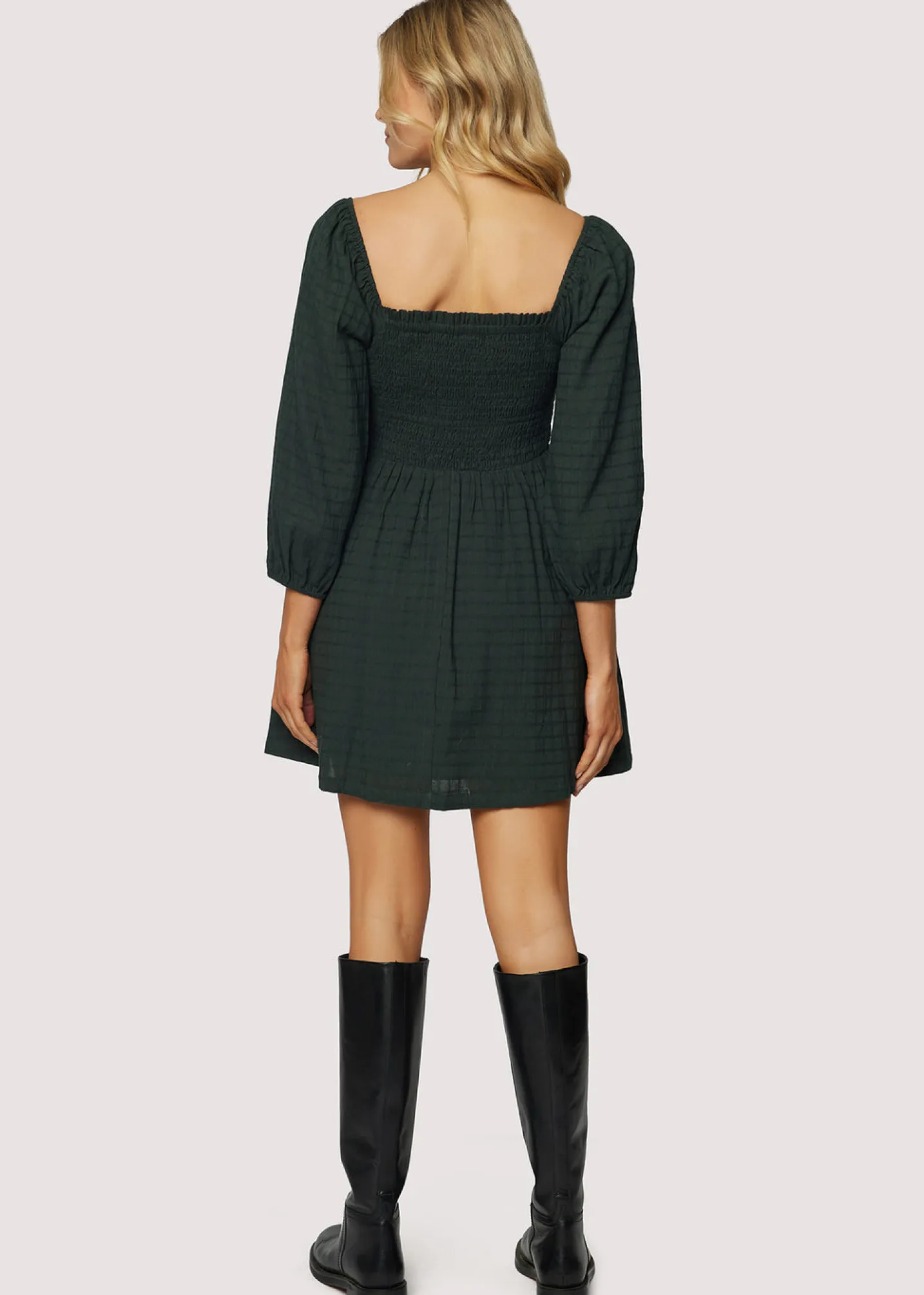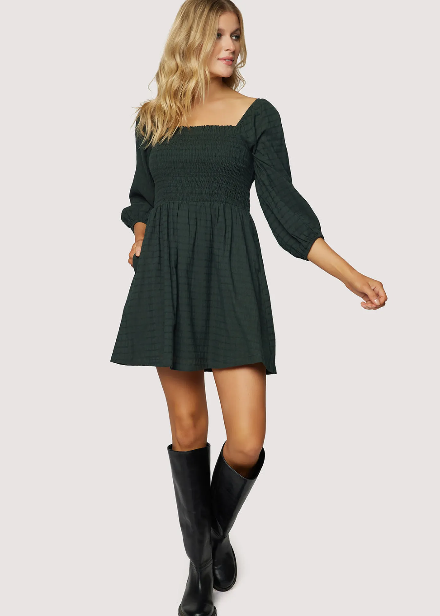 If you’re searching for your next go-to fall look, look no further! The Forest Jewel Mini Dress will give you more styling options than you can handle. This skater dress silhouette features a square neckline, smocked bust and hidden pockets.
