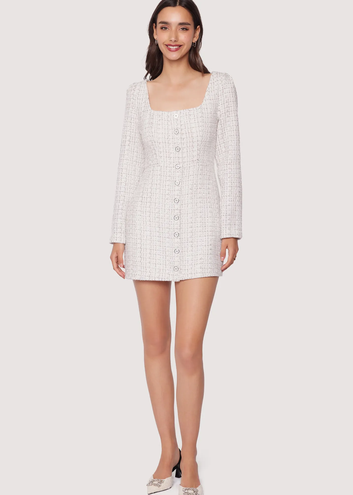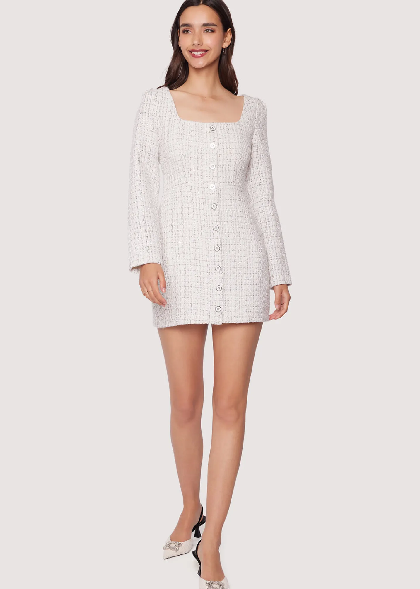 Louise Mini Dress offers a polished look for any occasion. It’s long sleeves tweed design and square neckline give it a timeless silhouette that will never go out of style. Non-functional front button detail adds an additional touch of sophistication, perfect for transforming your work look to night out look in minutes. Make a statement in Louise Mini Dress!