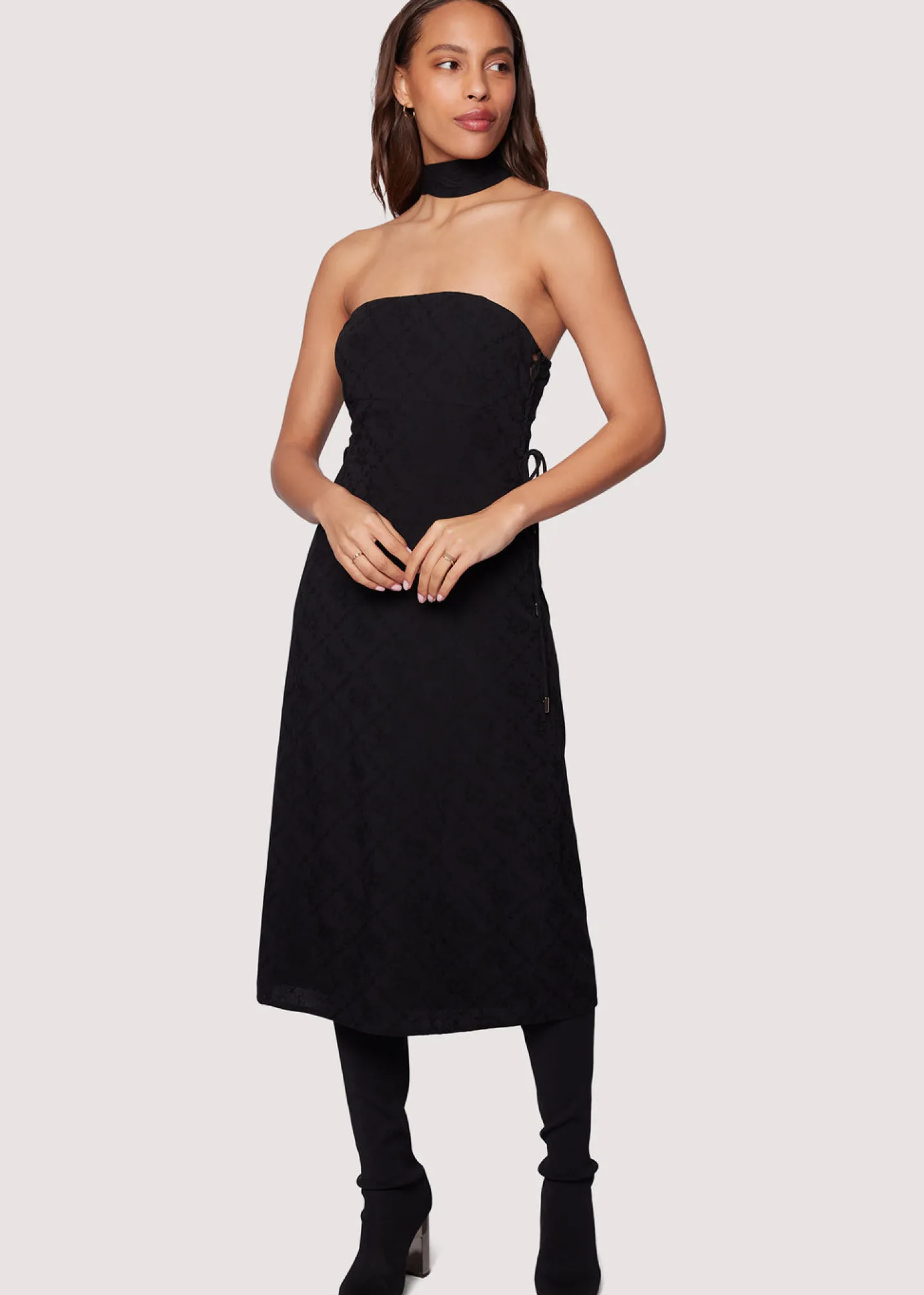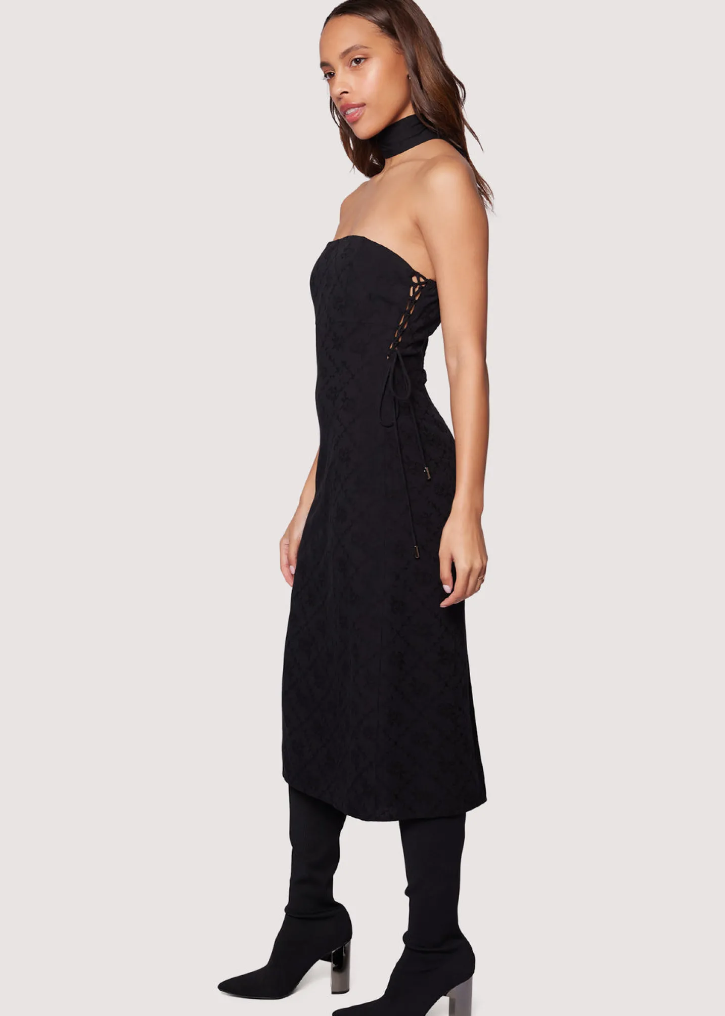 Introducing the Moon River Midi Dress – a mix of sophistication and glamour! Adorned with a neck tie, bow-framed back, and lace-up details, this black floral dress adds playful flair to your style. Exude grace and confidence in this versatile choice for any special occasion.