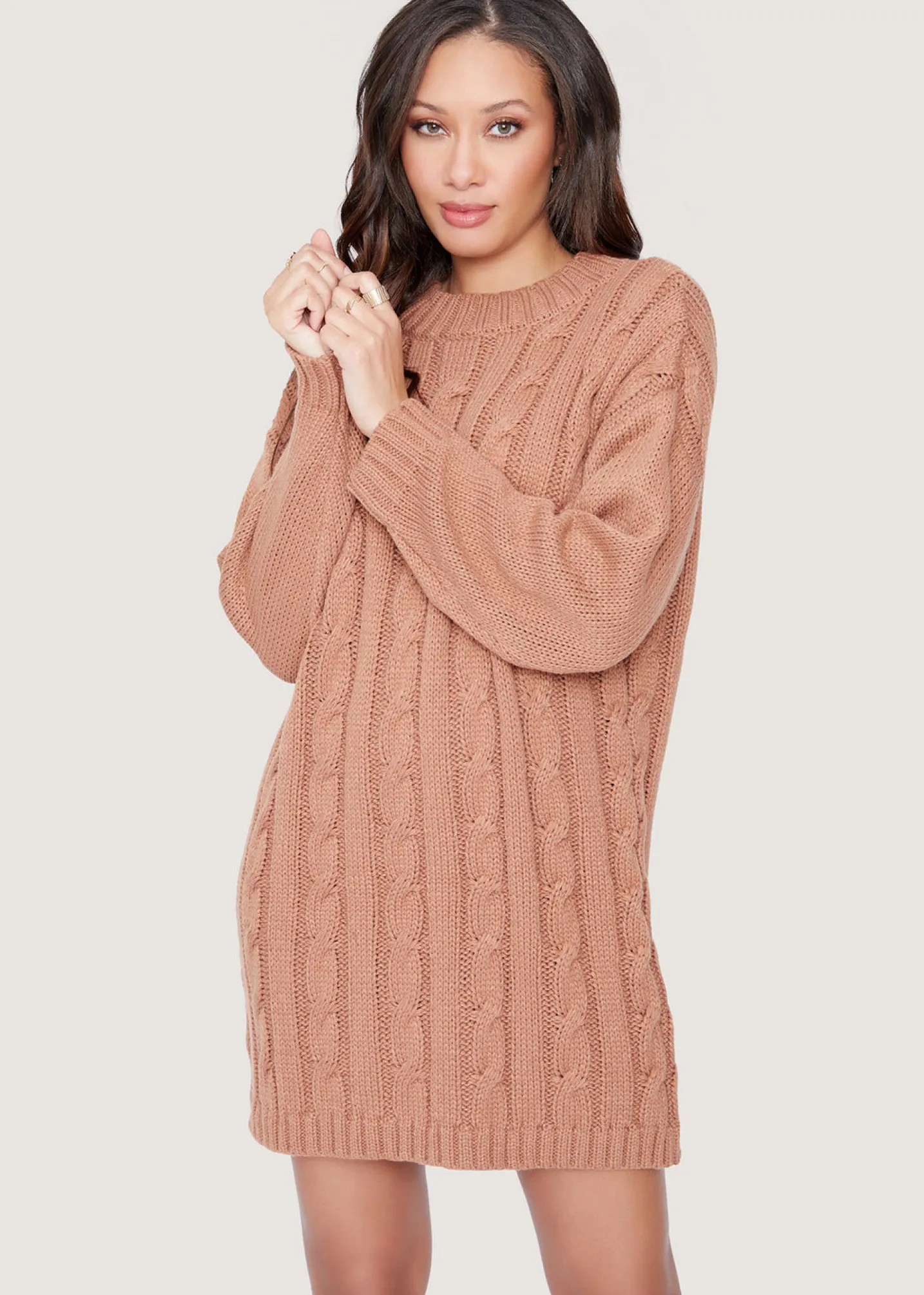 It’s time to get cozy in our Staycation Mini Dress! Chic, cable-knit designs form this oversized mini dress, with a fitted neckline and long sleeves with contrasting knit cuffs.