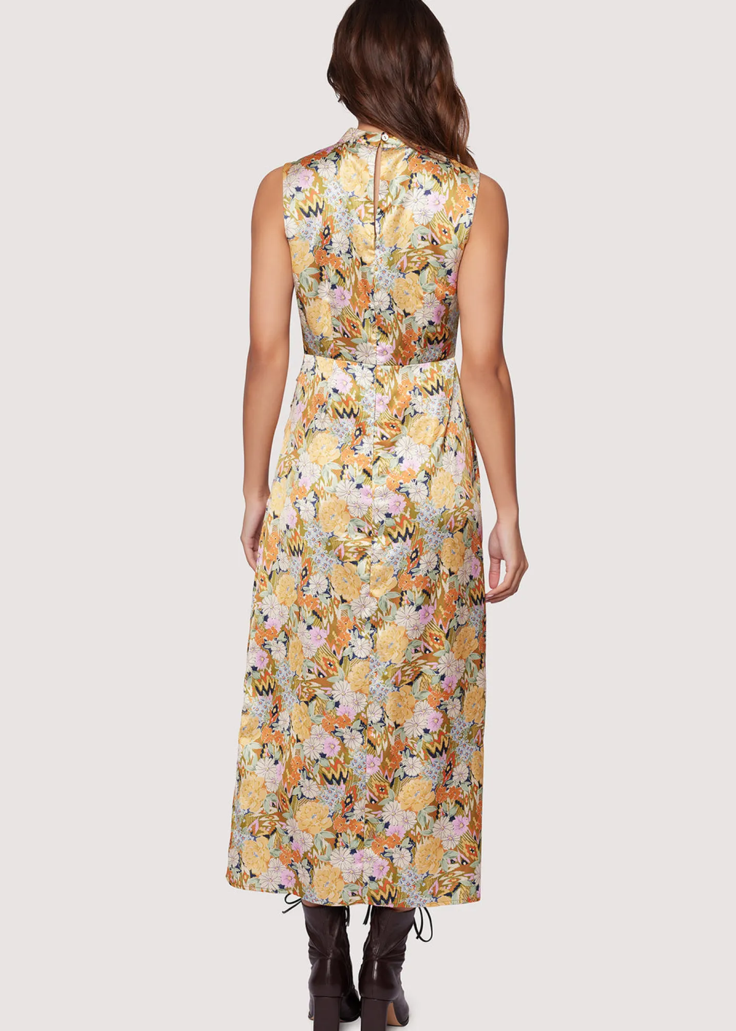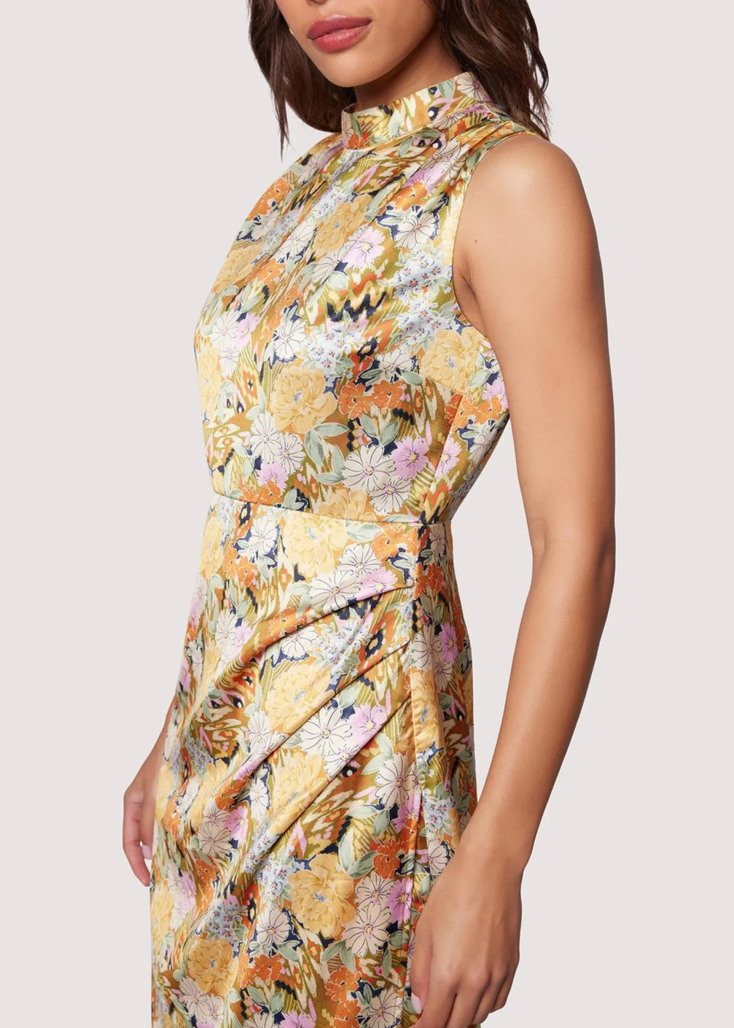 Achieve a look of timeless elegance in the Wildflower Dusk Maxi Dress. Crafted from luxuriously smooth satin, this piece features a high neck, fitted waist, and side sheering with high slit for a subtle hint of flirtation. The Victorian-style floral print is both classic and fashion-forward. Perfect for any special occasion!