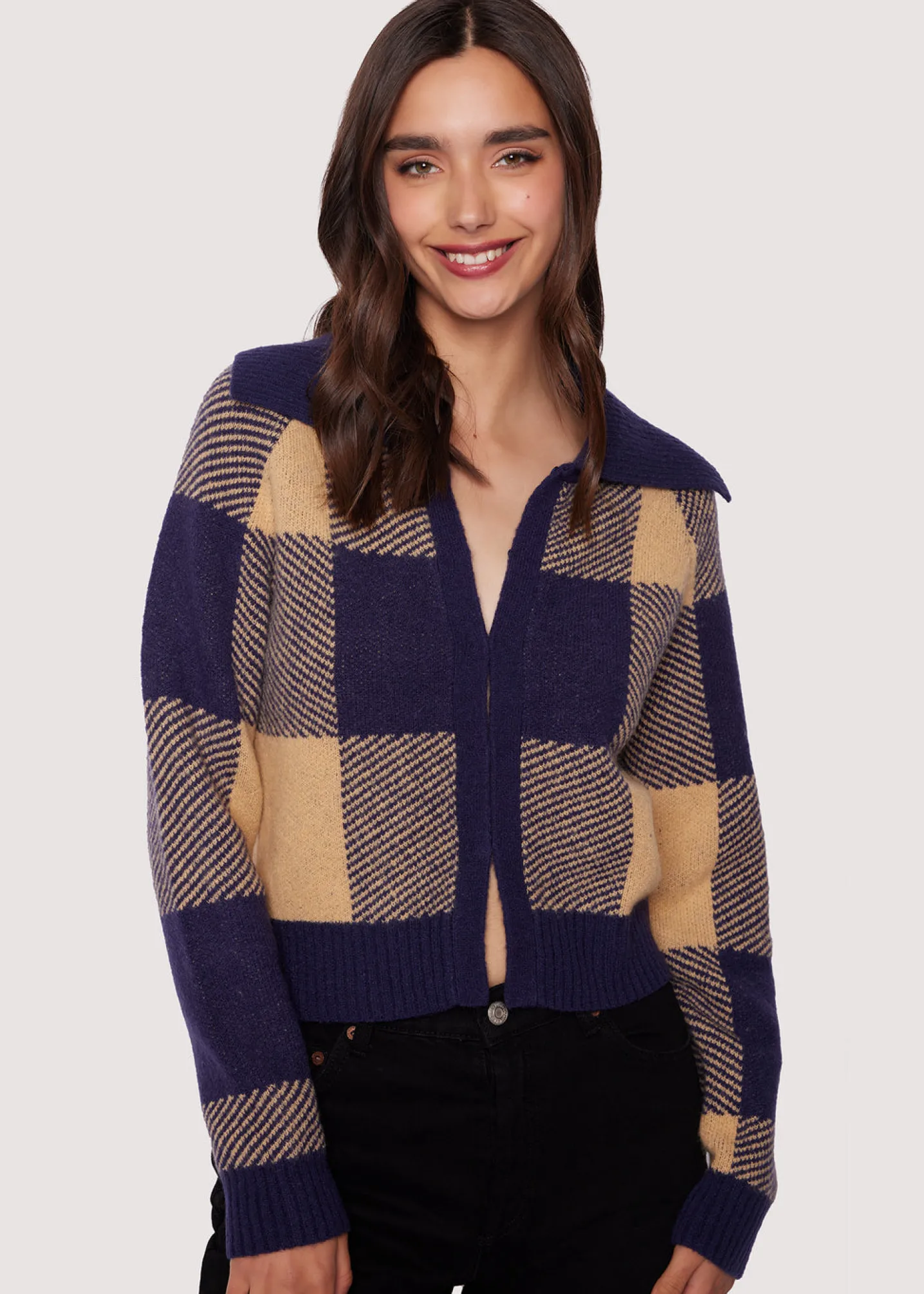 Put on the Lianna Cardigan and be ready for all your fall outings! This autumn essential features a soft navy blue and cream checkered pattern. It’s a classic look that complements any wardrobe.