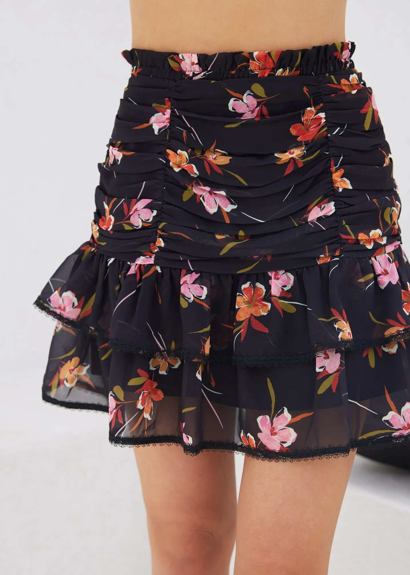 The bar will be set high for style among your peers while discussing fashion as you flaunt the Beachy Oasis Skirt! This unique style features a ruffle top trim just above an elastic waist and is shaped in a dark floral print for seasonal elegance. You will notice the sheering just below the elastic band as it begins to fall into tiered ruffles. The lace trim brings out a feminine element while the lining and back zipper brings functionally and an accurate fit.