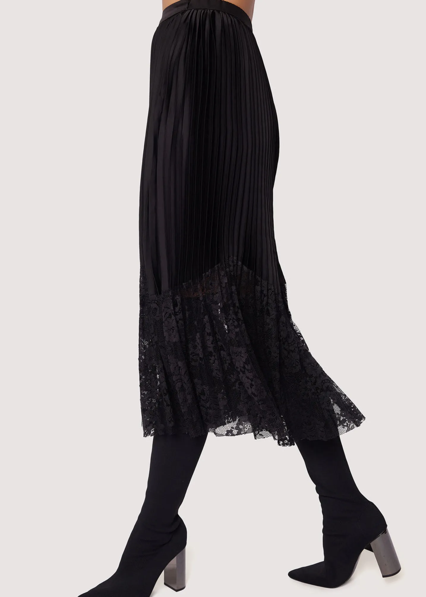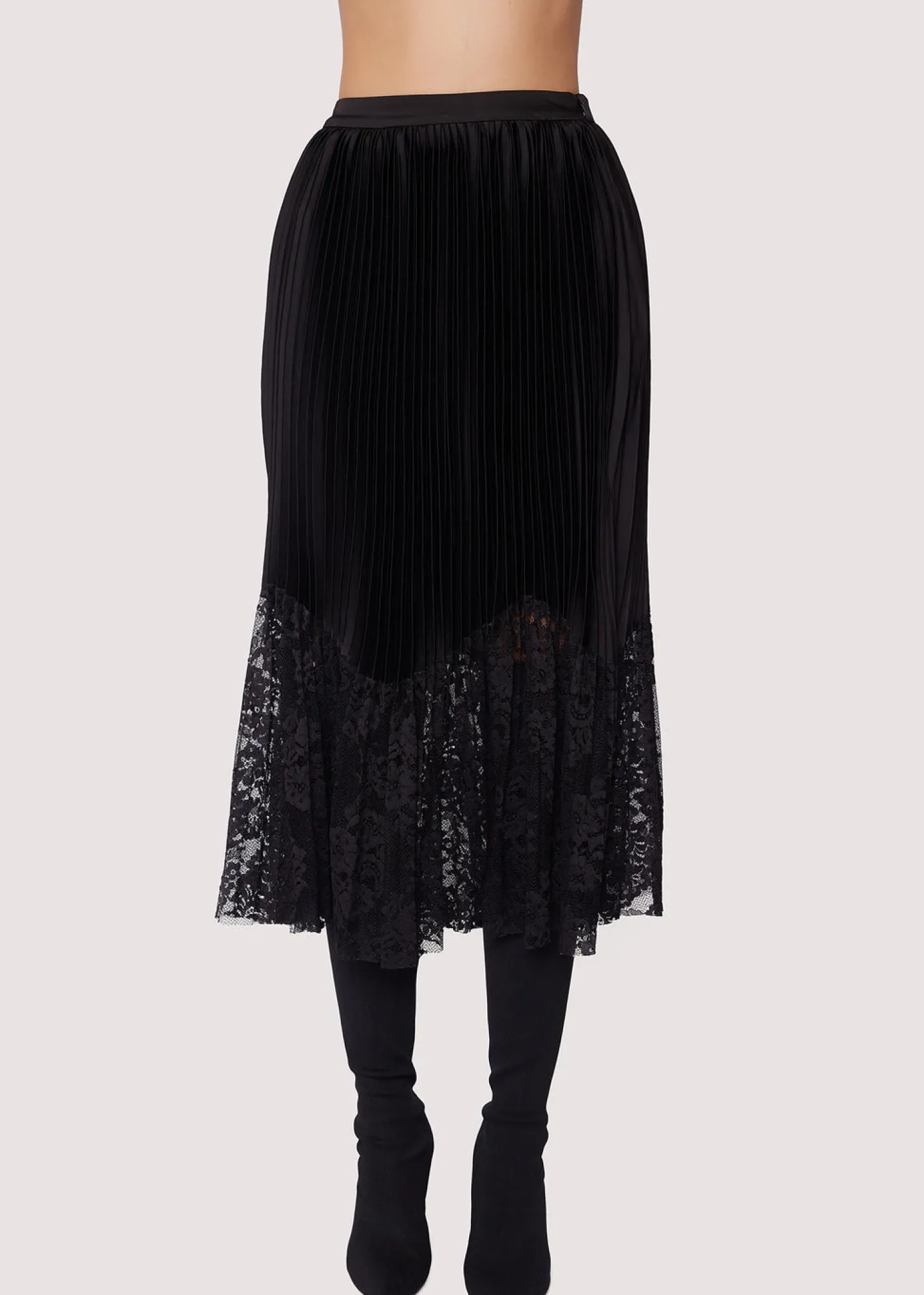 This beautiful black pleated midi skirt is the perfect way to transition from season to season! Made with sleek satin and finished with intricate lace trim, you’ll make a statement in any setting. The pleats add an extra touch of femininity and elegance. Perfect for special occasions and everyday wear!