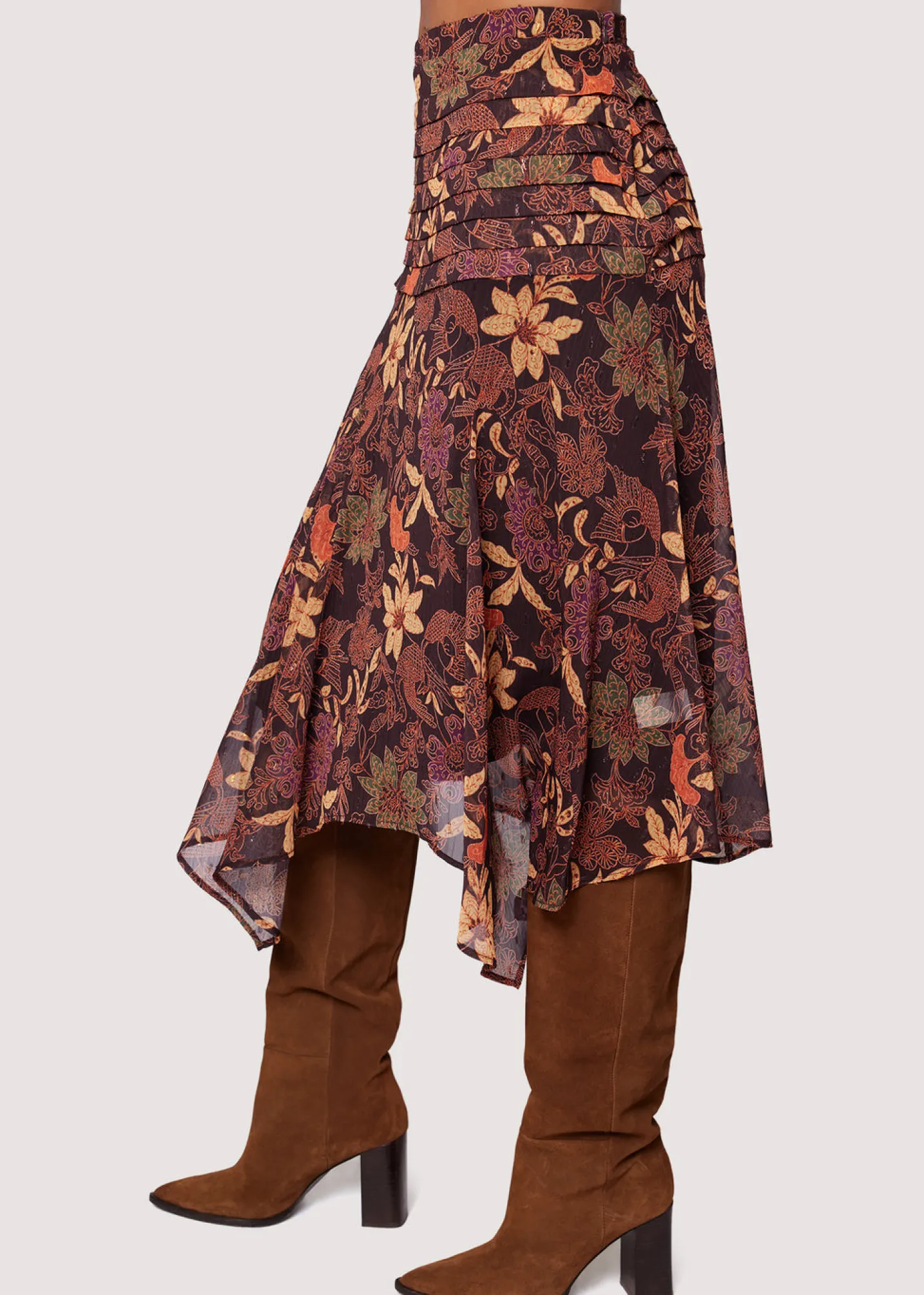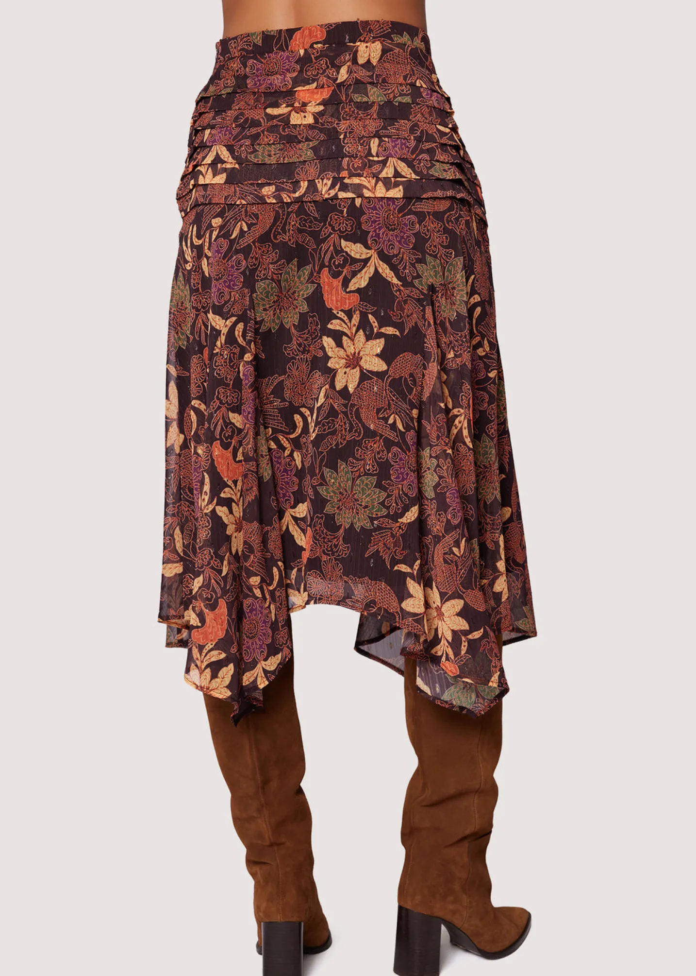 The Wild Bergamot Midi Skirt features a gracefully pleated low waistline and a whimsical handkerchief hem, adding a touch of charm to any ensemble. Elevate your style with this midi skirt, perfect for making a chic statement this season!