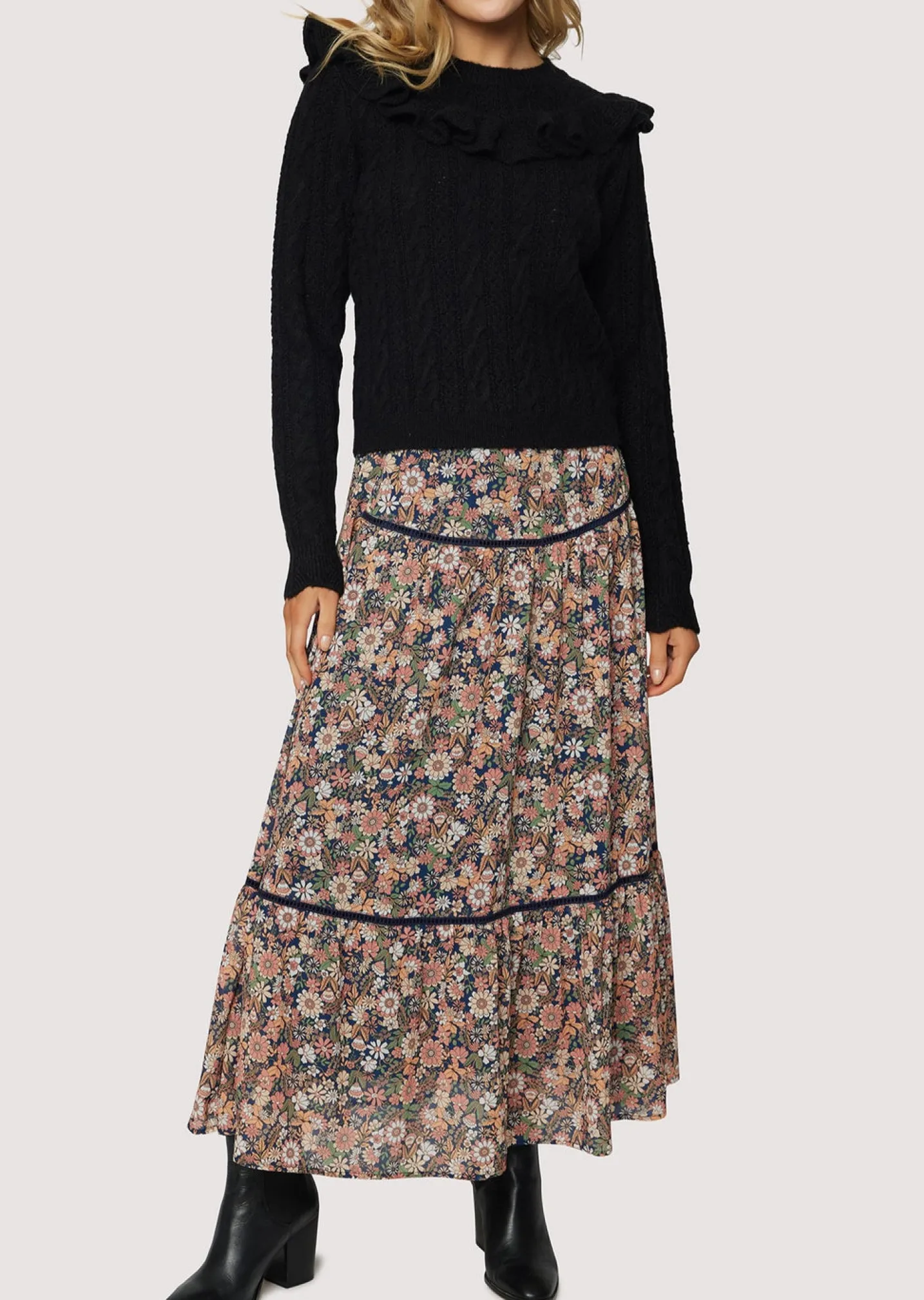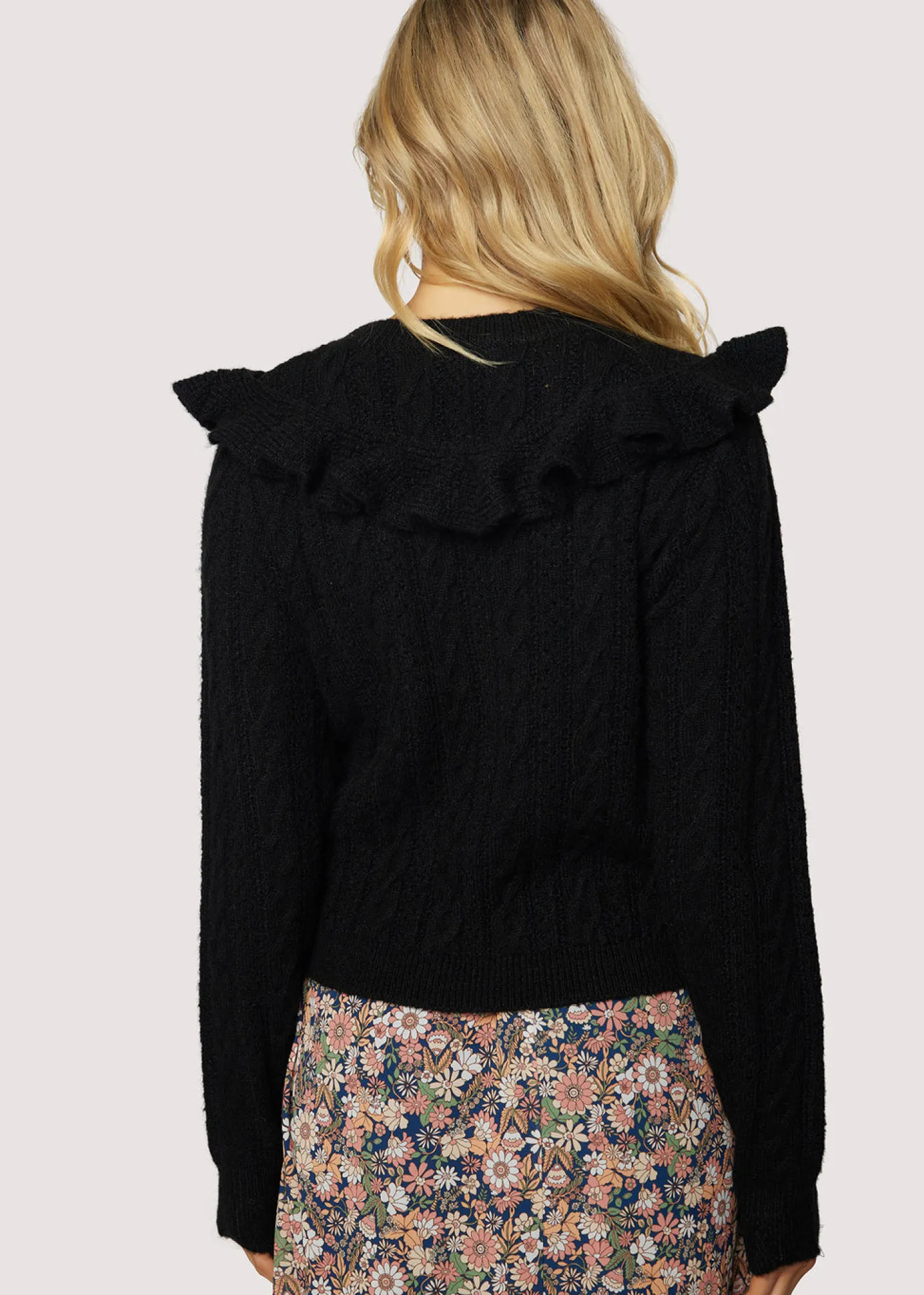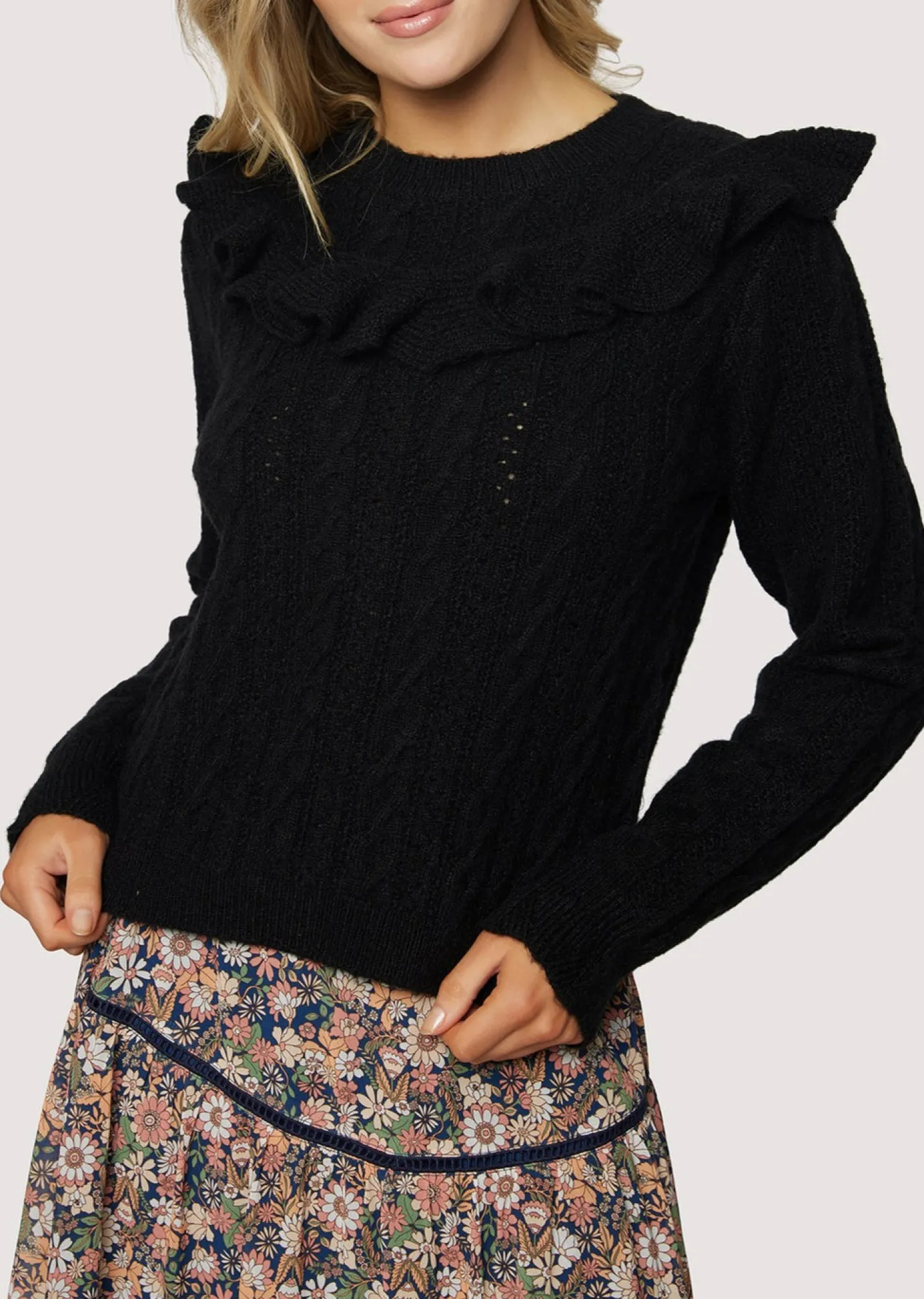 We definitely see you reaching for the Gracie Ruffle Top day after day because of its endless styling options! This top is an upgrade to your favorite black sweater by adding a trendy ruffle detail below the neckline while still honoring the classic, cable knit look.