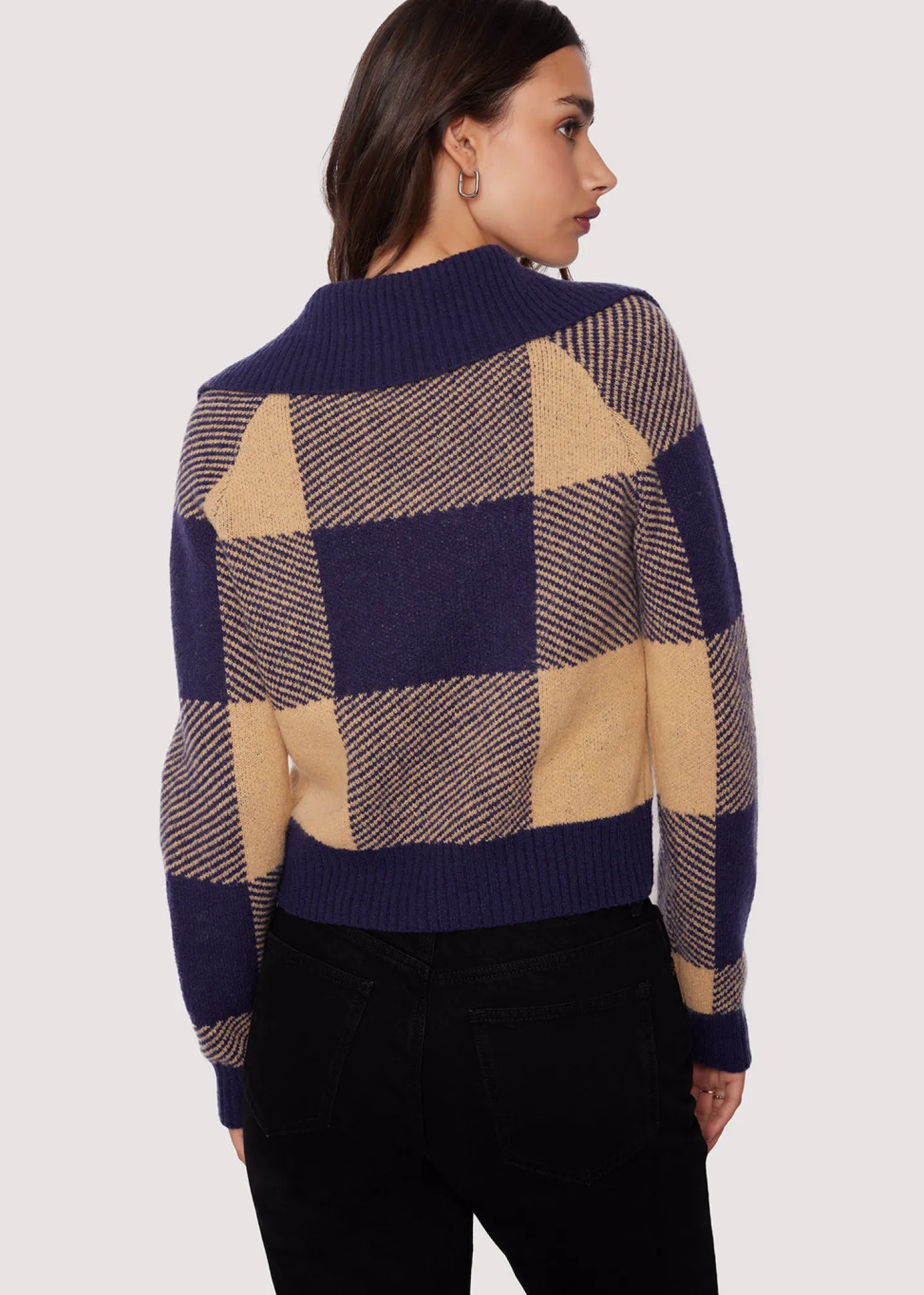 Put on the Lianna Cardigan and be ready for all your fall outings! This autumn essential features a soft navy blue and cream checkered pattern. It’s a classic look that complements any wardrobe.
