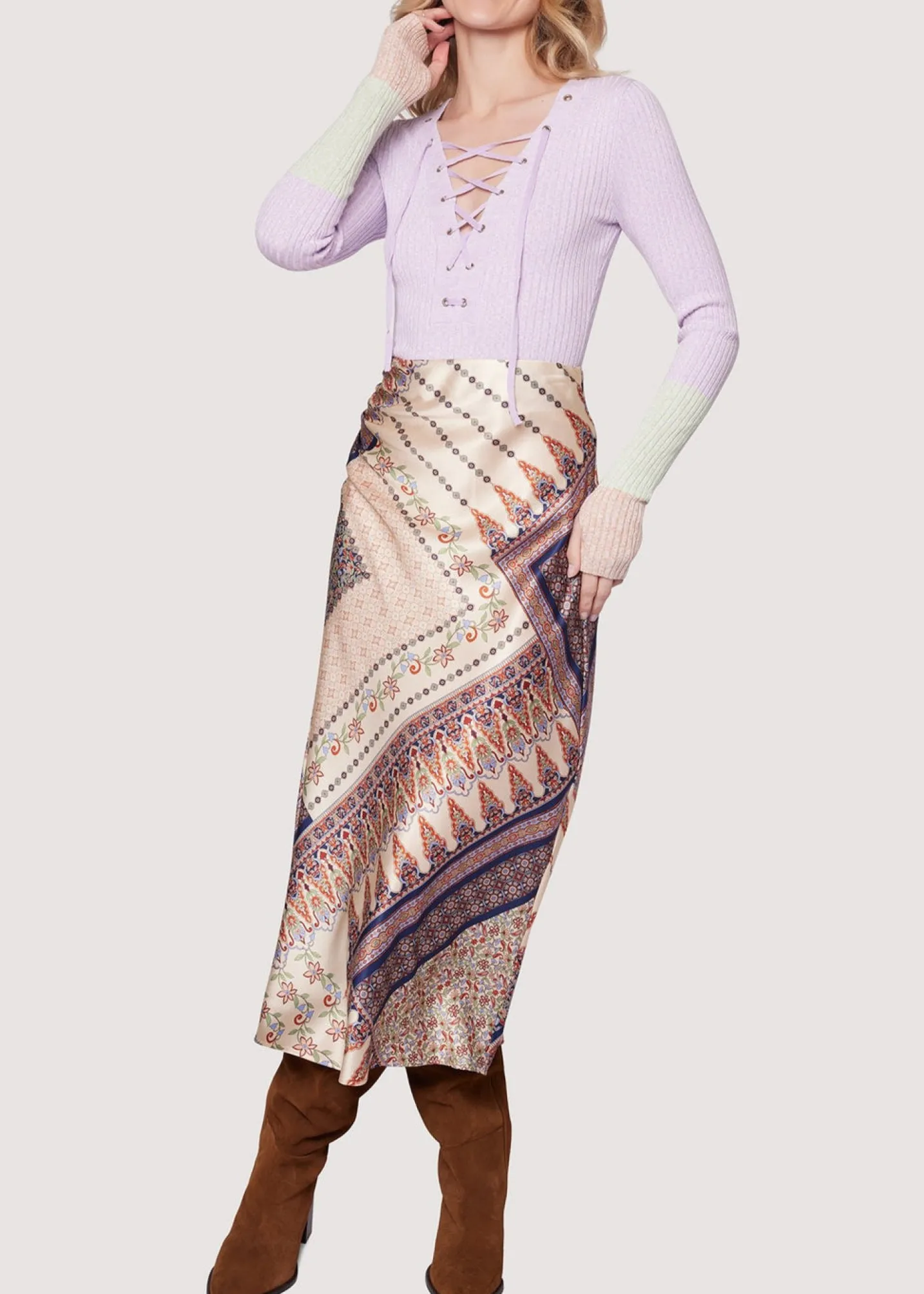 Get ready to step into fall with the Jolene Long Sleeve Top! This casual knit essential seamlessly transitions from day to night. Enjoy the flattering fit of a lace up v-neck and the stylish contrast of a block color with striking sleeves and hem. Perfect for any wardrobe!