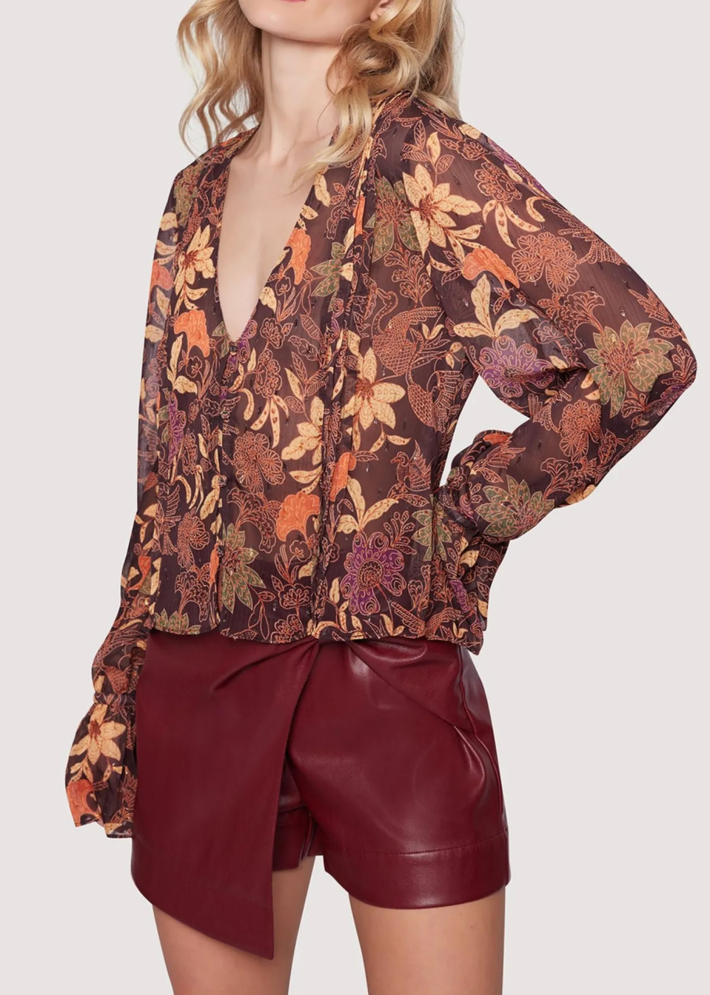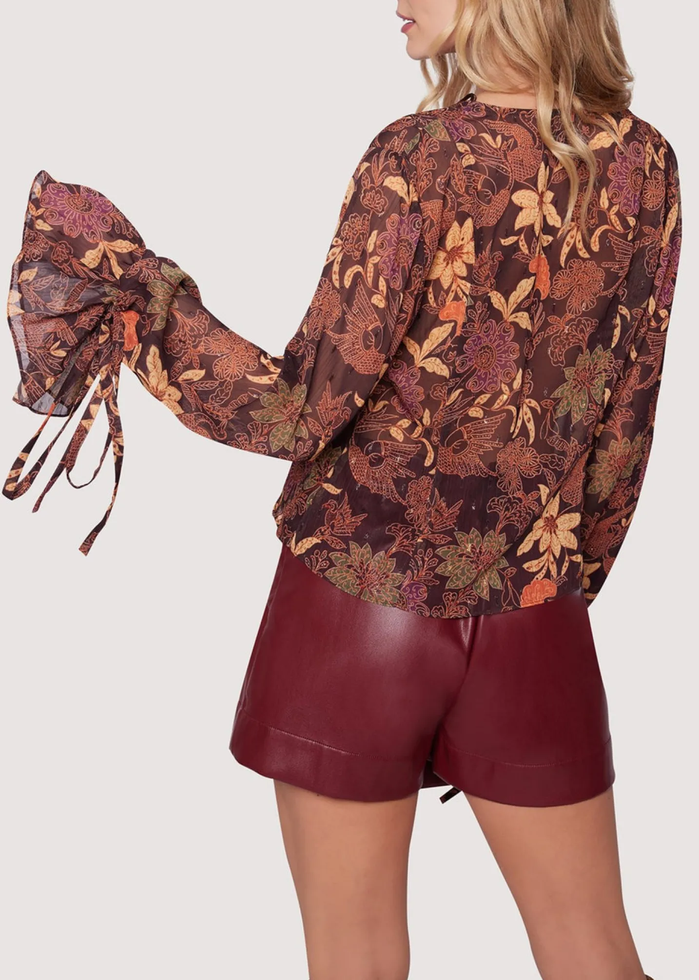 The Wild Bergamot Top boasts intricate pleats cascading down its loose, graceful body, accentuated by a stylish row of buttons. With its alluring V-neckline and long sleeves adorned with dramatic ties, this top exudes effortless charm, making it a versatile piece for elevating any ensemble with flair and grace.